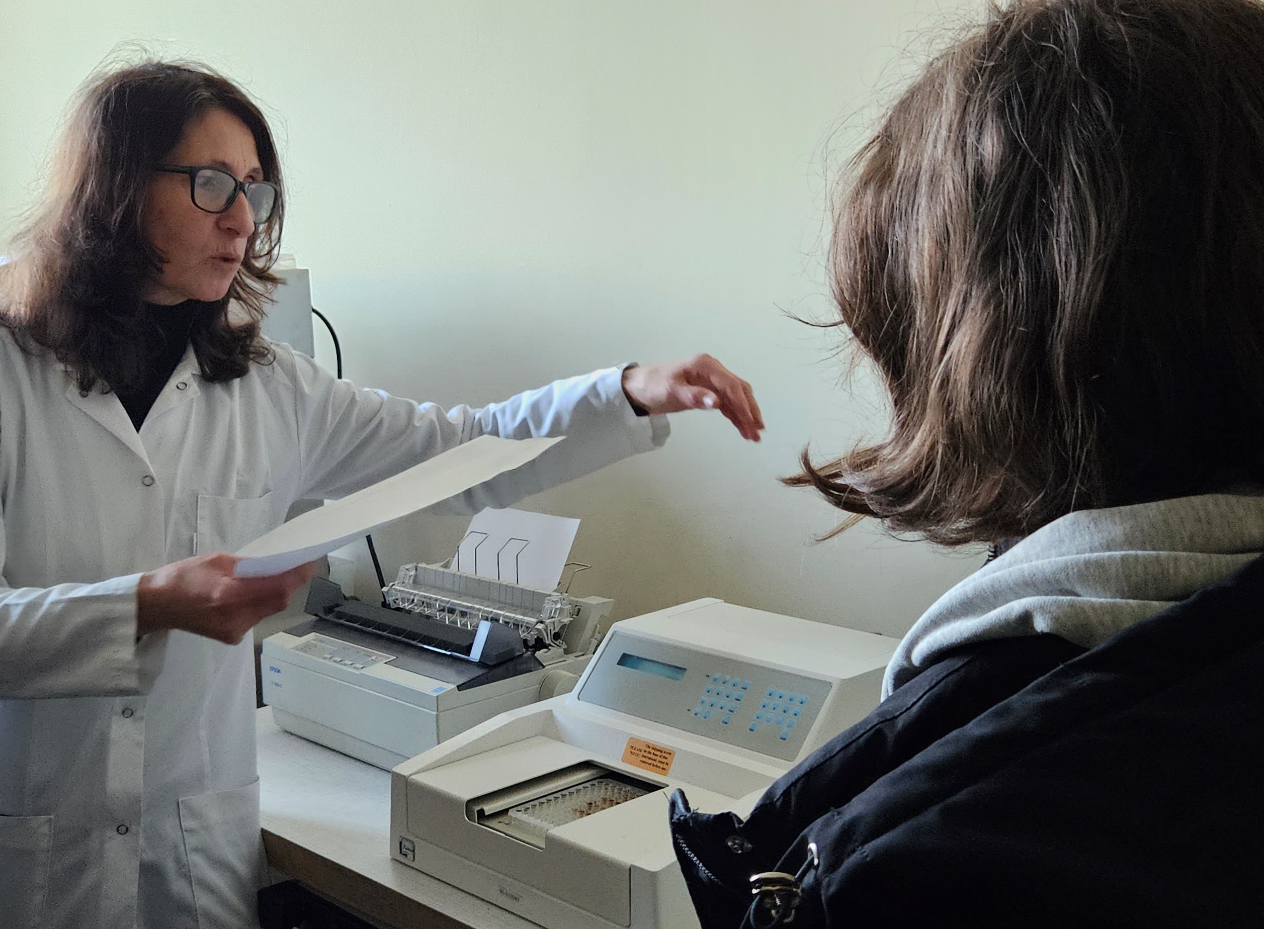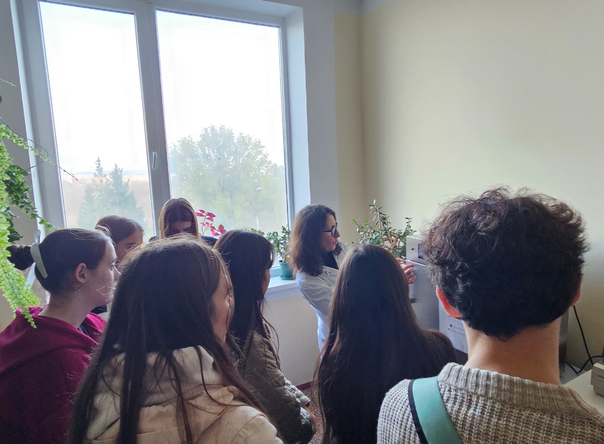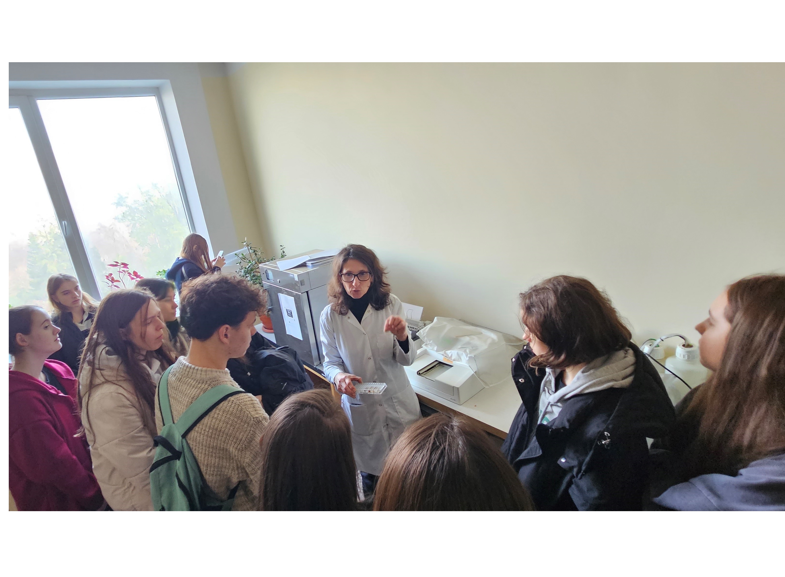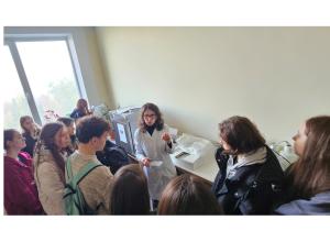 Vizita în cadrul Laboratorului de Biotehnologii Vegetale, a fost coordonată de șefa laboratorului dna dr MĂRÎI Liliana. Elevii au fost familiarizați cu principalele direcții de cercetare, iar activitățile au avut un caractere informativ și practic. Liceenii au avut parte de demonstrații ce țin de vizualizarea unor obiecte biologice (radiculele și frunze) la stereomicroscop și microscopul optic, analizând diferențele structurale care reflectă adaptarea plantelor la stres. Pe baza acestor observații inițiale, discuțiile s-au concentrat asupra unor structuri microscopice precum stomatele și rolului lor esențial în reglarea schimburilor de gaze și grăuncioare de polen pentru a înțelege diversitatea structurilor implicate în reproducerea plantelor. Demonstrația capacității de analiză a structurilor biologice a continuat prin prezentarea microscopului electronic, subliniind diferențele dintre rezoluția optică și cea electronică. Ulterior, elevii au asistat la demonstrații privind utilizarea unor tehnici cantitative prin prisma spectrofotometrului cu microplăci. Totodată, elevii au fost familiarizați cu modul în care sunt modelate condițiile de stres abiotic în camera climaterică, cu prezentarea unor senzorii utilizați pentru monitorizarea precisă a experimentelor.