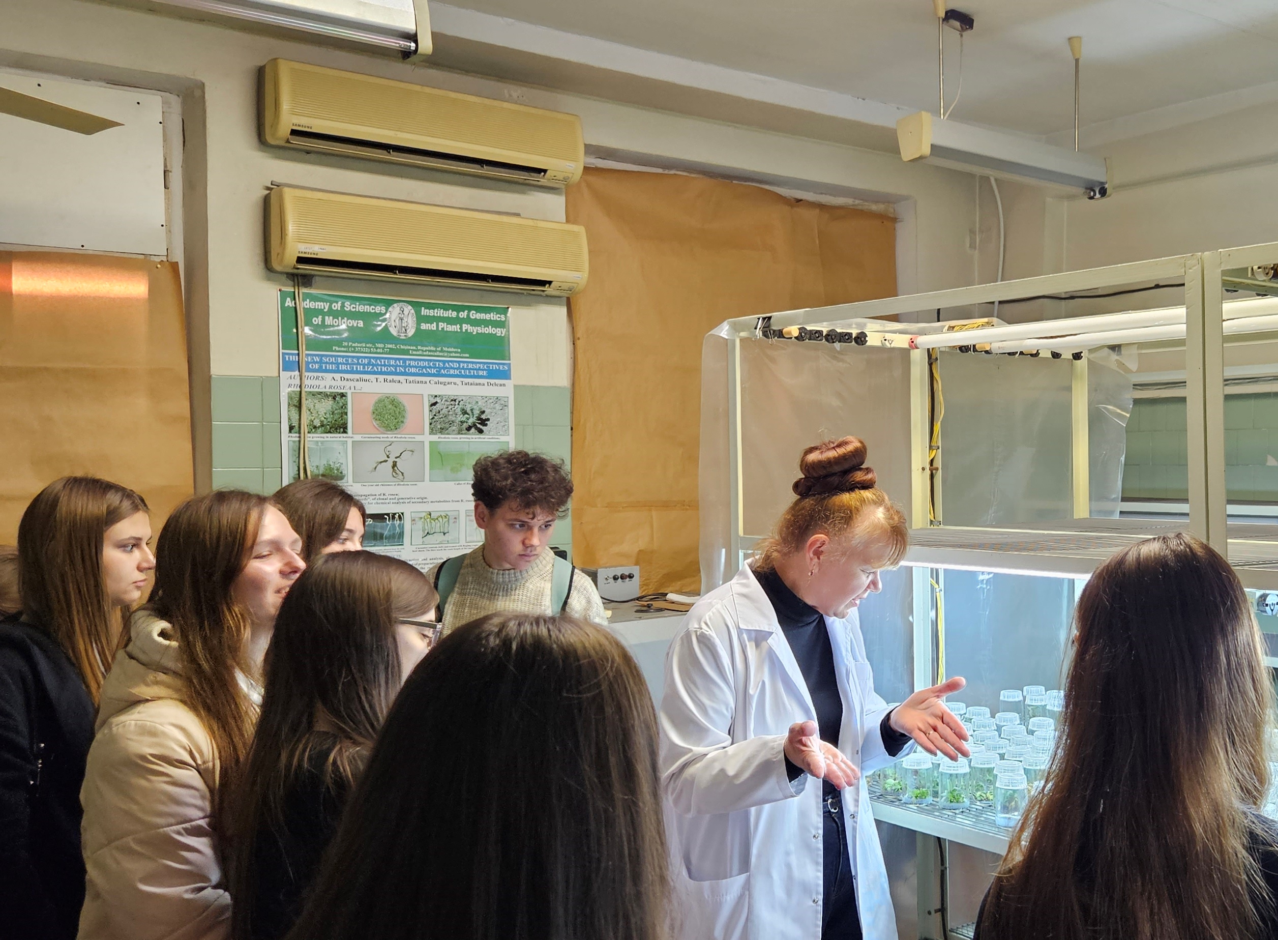 Unul dintre momentele centrale ale vizitei a fost excursia în Blocul Biotehnologic, ghidată de dr. CĂLUGĂRU-SPĂTARU Tatiana, șefa Laboratorului Biochimia Plantelor. În cadrul sesiunii, elevilor le-au fost prezentate: importanța culturilor in vitro în conservarea biodiversității, în multiplicarea speciilor rare și protejate și în obținerea materialului săditor de înaltă calitate; tehnologiile moderne utilizate în biotehnologia plantelor, accentul fiind pus pe etapele fundamentale ale micropropagării precum inițierea culturilor, faza de multiplicare, stimularea înrădăcinării și procedurile de aclimatizare ex vitro; rolul biotehnologiilor în cercetarea avansată, inclusiv contribuția lor la ameliorarea trăsăturilor de interes economic, ecologic sau ornamental.